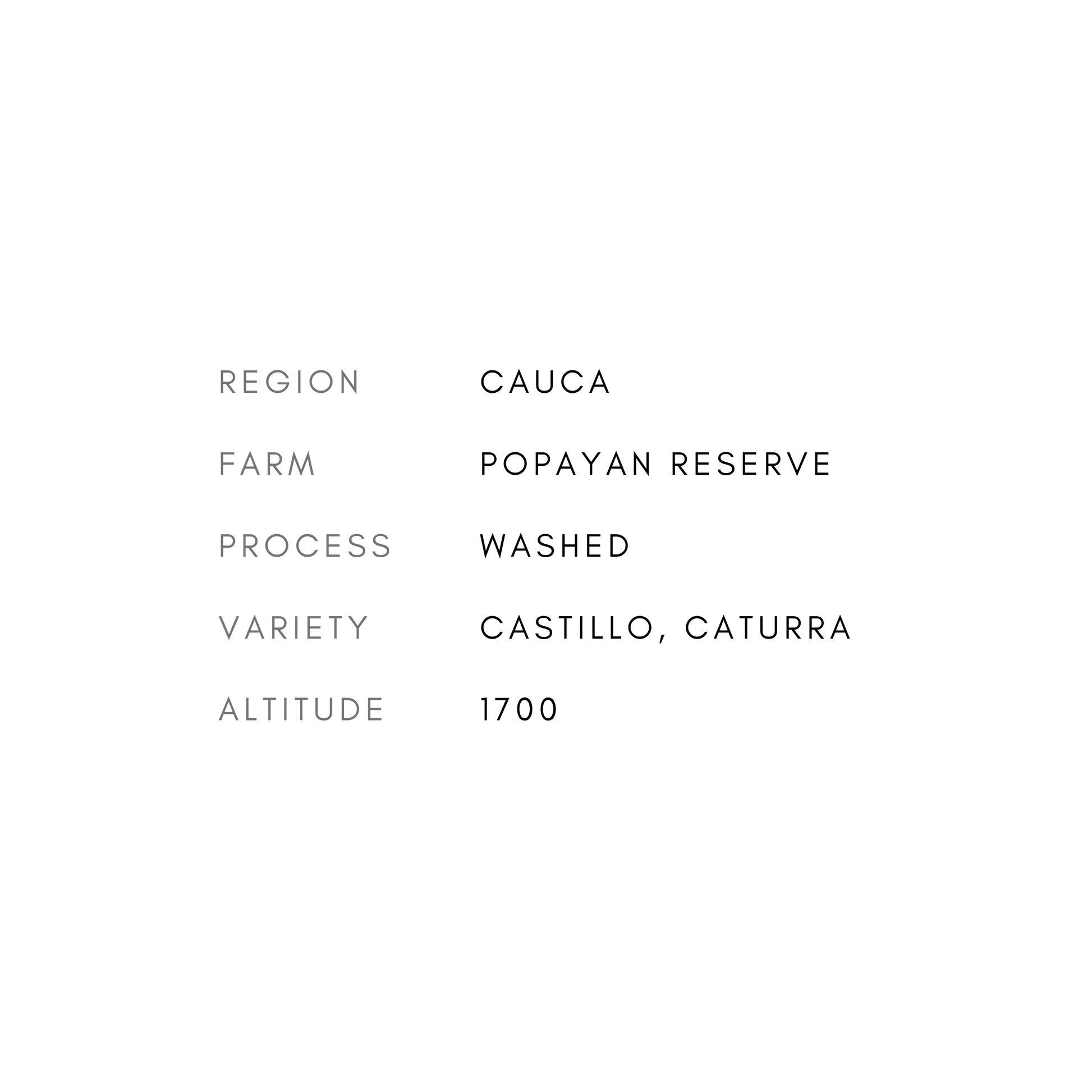 The Meseta de Popayan is sheltered by the Andes mountain range which helps generate homogeneous climatic and altitudinal characteristics - the topography is perfect to grow exceptional coffee! The result is a balanced cup profile with a full body.