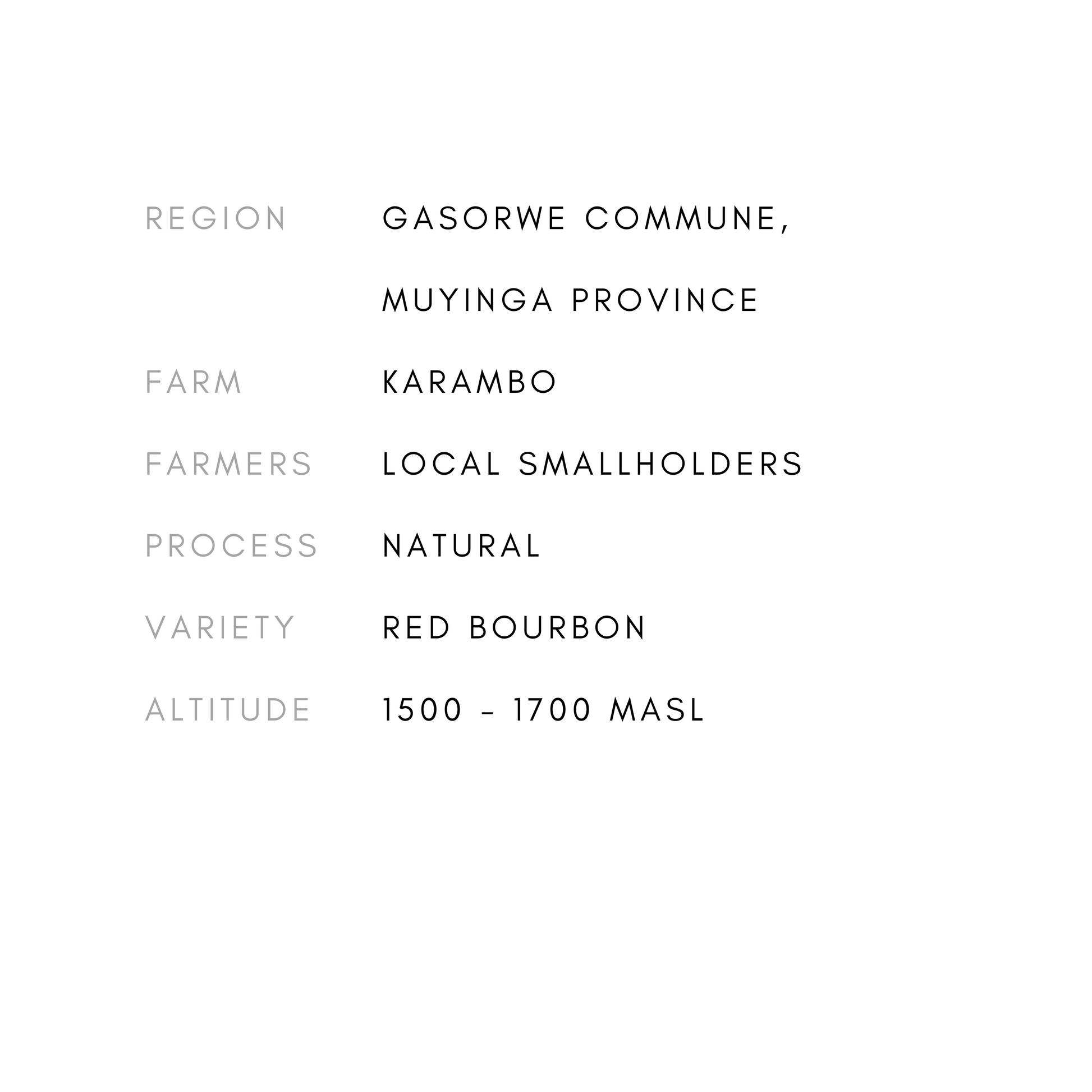 This Is Burundi Coffee (TIB) has built relationships with producers in Gasorwe Commune, partnering with the Izuba station to develop Karambo—a new washing station launched in 2021 focused on improving coffee quality and operations for greater producer profits. Located on Karambo Hill in Muyinga District, northeast Burundi, the station benefits from ideal drying conditions at 1500–1700 MaSL. In one year, Karambo doubled its processing capacity, quickly establishing Muyinga as a rising region for high-quality coffee alongside Kayanza.